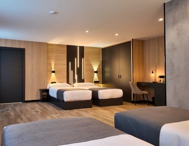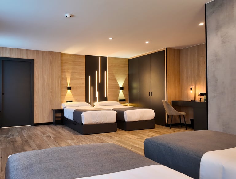 Una habitación espaciosa con capacidad para hasta 6 personas, ideal para grupos o familias numerosas. Cuenta con dos baños completamente equipados, uno de ellos adaptado para personas con movilidad reducida, lo que garantiza la accesibilidad y la comodidad de todos.